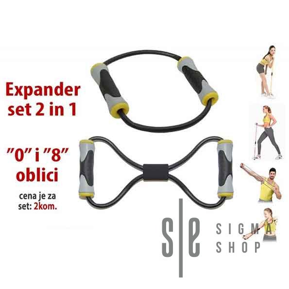 Oba ekspandera su od zatvorene elastične gume sa plastičnim ručkama. Set sadrži dva expandera različitog oblika: ekspander oblika “O” i ekspander oblika”8″. Kombinovanom upotrebom gumenih ekspandera možete izvoditi različite vežbe pomoću kojih oblikujete i definišete telo i povećate kondiciju i izdržljivost. Vežbači ove rekvizite manjeg otpora koriste da uz veći broj ponavljanja oblikuju mišiće: ramena, grudi, leđa, ruku…
